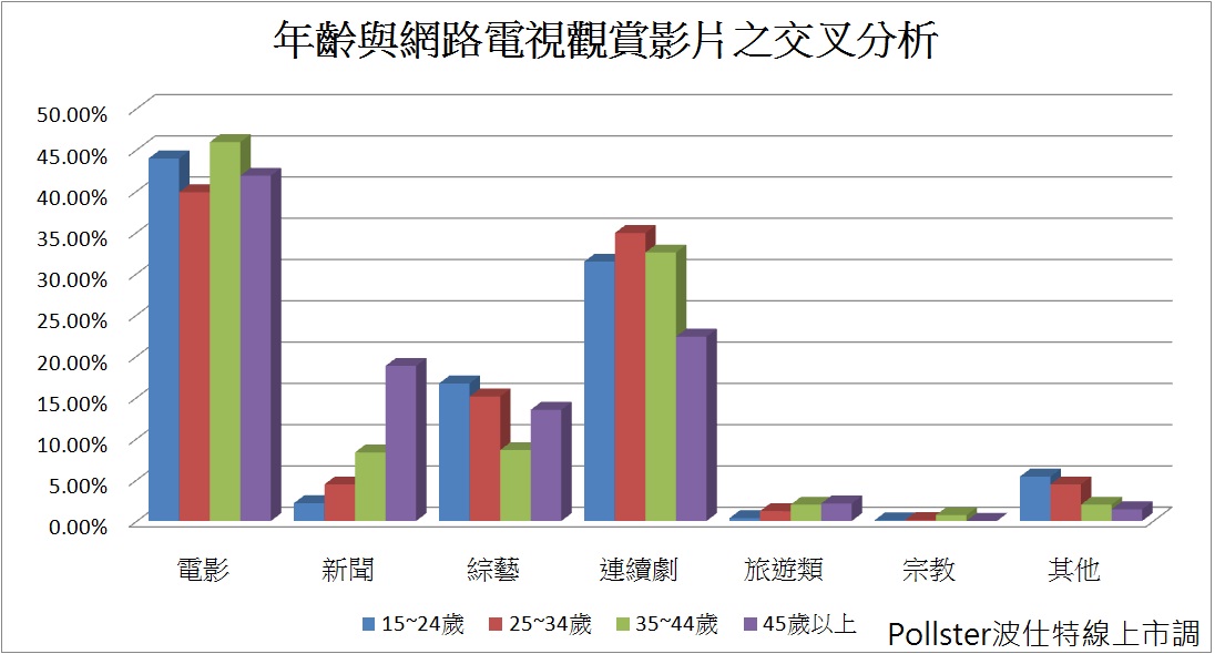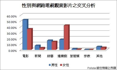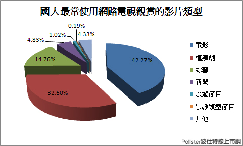另據波仕特(Pollster)線上市調:網路電視收視戶,以收看電影和連續劇為最大宗。